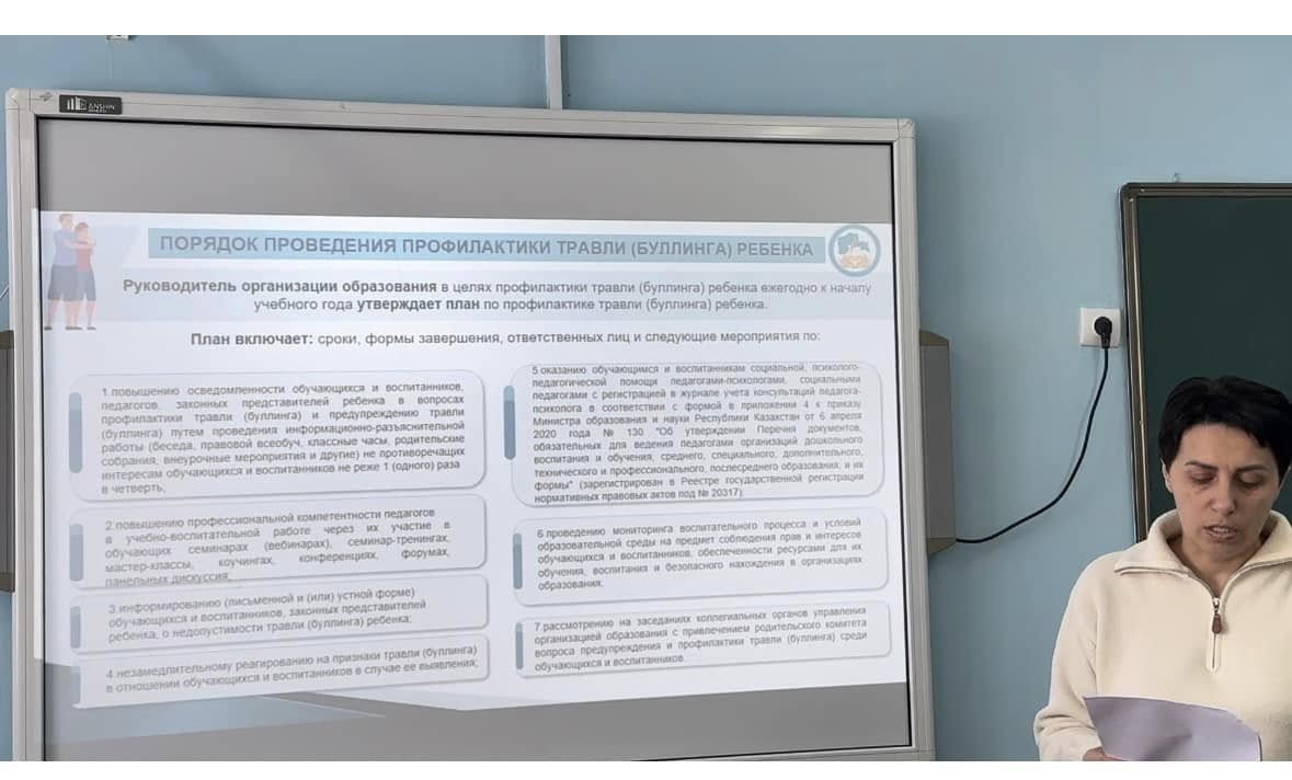 Кездесу тақырыбы “Кәмелетке толмағандар арасында қорқытудың алдын алу” — бұл құбылыс, өкінішке орай, қазіргі заманғы оқу орындарында өзекті болып қала береді. Талқылау барысында келесі негізгі аспектілер қарастырылды:* Қорқытудың анықтамасы: бұл құбылыс дегеніміз не, оның түрлері мен көріну формалары.* Қорқытудың себептері: балалар арасындағы жанжалды жағдайларға ықпал ететін психологиялық және әлеуметтік факторлар.* Қорқытудың алдын алудағы мұғалімдердің рөлі: мұғалімдер қорқыту белгілерін қалай таниды, зардап шеккендерге қолдау көрсетеді және қақтығыстарға уақытында жауап береді.* Алдын алу әдістері: сыныпта және жалпы Мектепте қауіпсіз және қолдау көрсететін атмосфераны құруға көмектесетін тиімді стратегиялар мен тәсілдер.